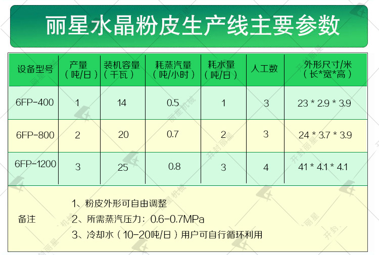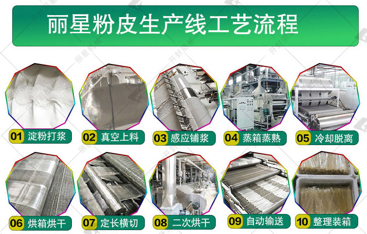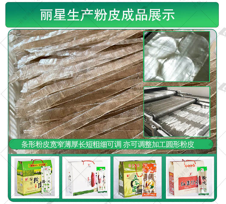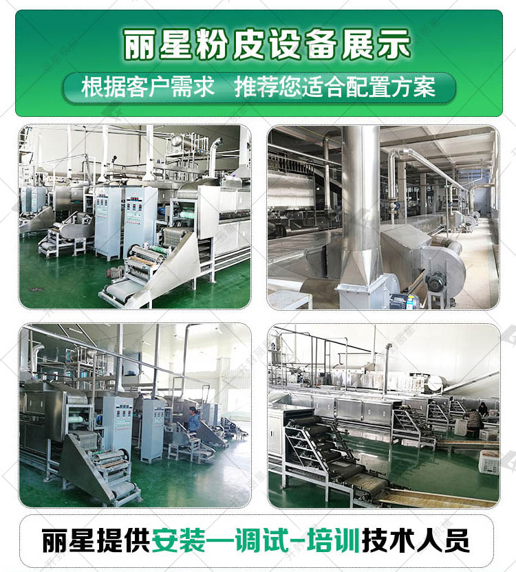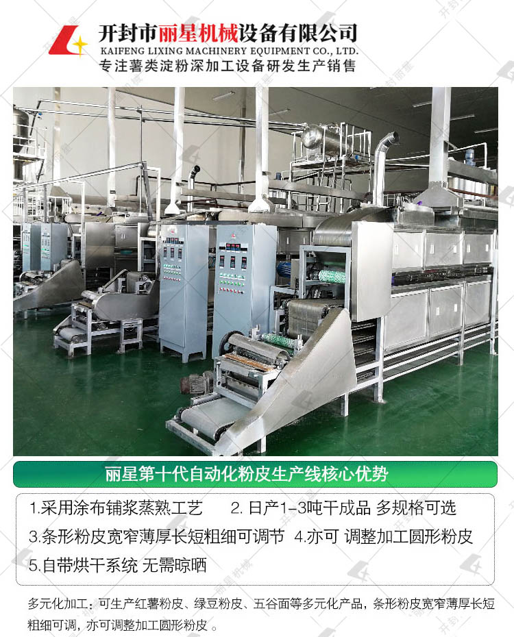 麗星粉皮生產(chǎn)線采用室內(nèi)作業(yè)制粉理念,升級(jí)蒸汽換熱系統(tǒng),從淀粉和漿到定長橫切出機(jī)自動(dòng)化、流水線作業(yè),原料只需薯類淀粉和食用水。