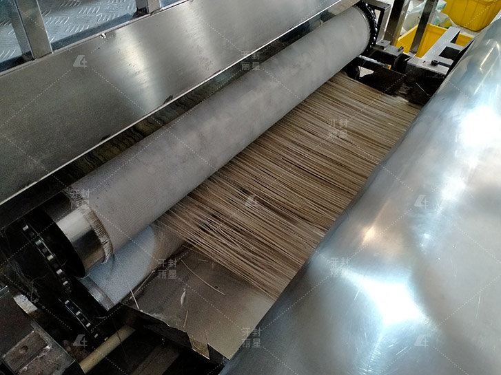 工藝流程:預熱→螺旋攪拌→真空上料→恒溫儲料(攪拌)→刮板下料成型→熟化(蒸汽蒸熟)→冷卻→脫離→常溫老化→低溫老化(冷庫)→豎切絲→低溫大風量定型干燥→降溫(進冷風)→定長橫切→包裝。
