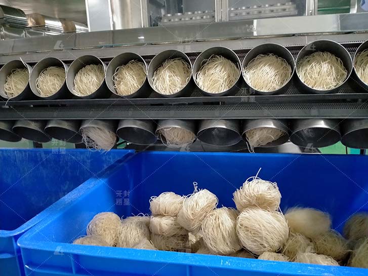 工藝流程:預(yù)熱→螺旋攪拌(恒溫儲料)→真空攪拌→刮板下料成型→蒸熟(蒸汽)→冷卻→脫離→常溫老化→低溫老化(冷庫)→豎切絲→定量稱重-→裝碗→自動成型→連續(xù)性干燥→除潮→涼化→成品包裝。